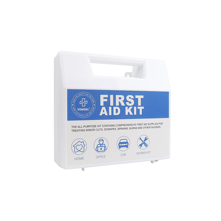 This office first aid kit, home first aid kit, or car first aid kit comes in a durable plastic case complete with an easy-to-carry handle and holes for mounting on a vertical surface
