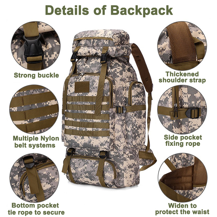 - Perfect for camping trips, the backpack's large capacity allows you to carry tents, sleeping bags, cooking equipment, and more.