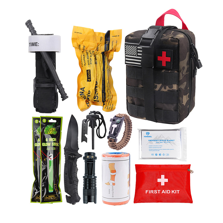 - Items like the tourniquet and trauma wound dressing are critical for dealing with serious injuries on the go.